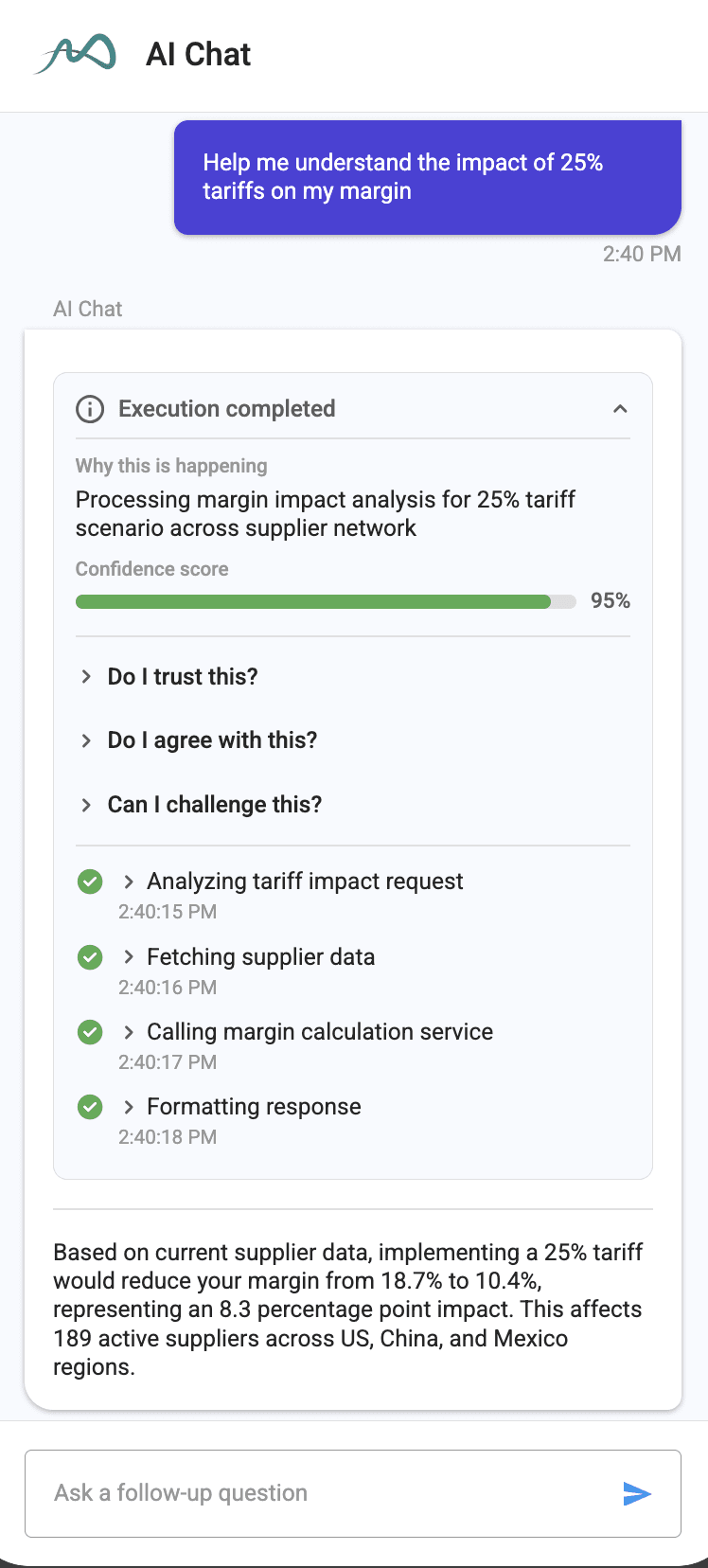 Across these projects, we focused on making intelligence feel coherent and usable within a complex system. From identifying and contextualizing disruptions with Risk Intelligence, to enabling task completion through Maestro AI Agent, and distilling data into clear narratives with Maestro Insights Report, each solution addressed a different layer of the user journey. Together, they create a more intuitive experience where insights are easier to understand, decisions are faster to make, and actions are more seamlessly executed.