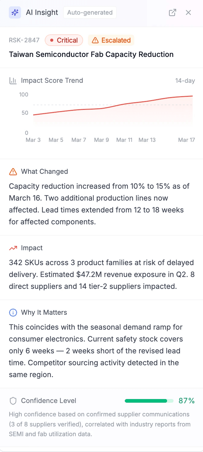 Risk Intelligence scans global events and translates them into supply chain impact.